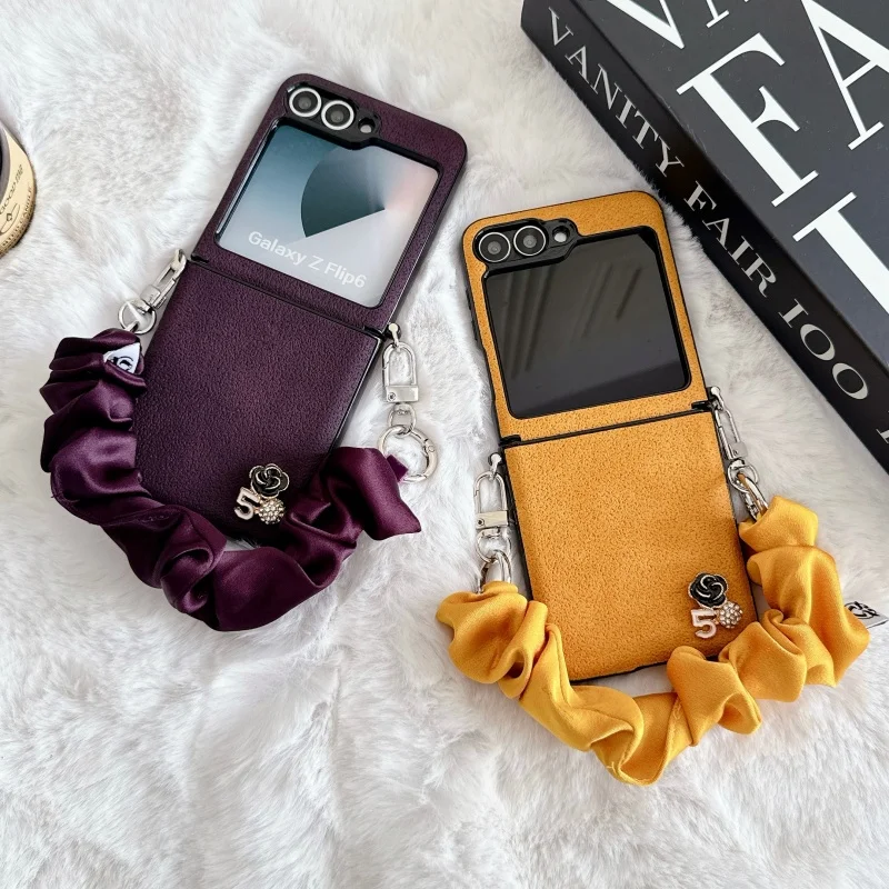 Fashion Cute Camellia Leather Phone Case For Samsung Galaxy Z Flip 7 6 5 4 3 Flip6 Flip7 Cover with Silk Scarf Chain Cases Capa $10.84