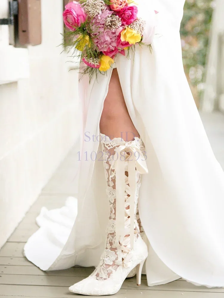 White Lace Cross-tied Knee-high Boots Pointed Toe Silk Riband Elegant Modern New Autumn Women's Fashion Wedding Shoes 2025 $90.44