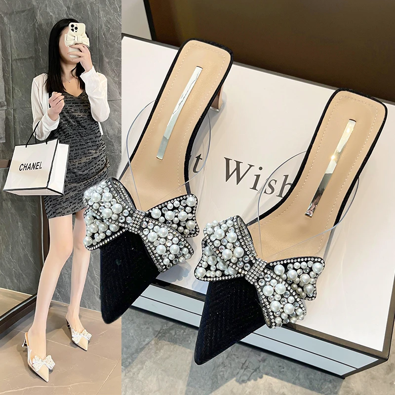 Fashion Heeled Sandals for Women Black Pink Women's New Shallow Bow Women's Shoes Thick Mid Heel Cool Sandals Sandalias De Mujer $5.08