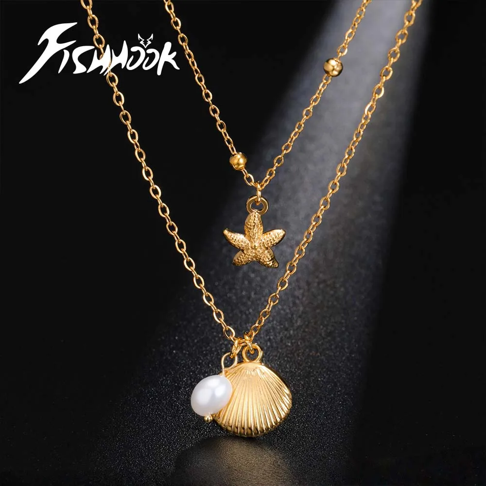 Ocean Shell Starfish Beach Necklace for Men Woman Girl Couple Double Chain Stainless Steel Gold Color Jewelry Gift Choker $2.57