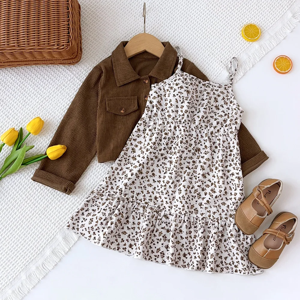 Girls Set Spring Autumn Korean Version Solid Color Long Sleeved Lapel Jacket Floral Suspender Dress Casual and Fashionable $8.22
