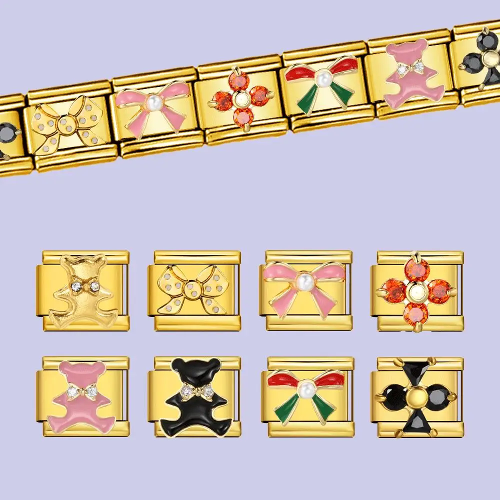 Cute Bear Bowknot Pattern Zirconia Colorful Bead DIY Gold Color Italian Charm Bracelet Fit 9mm Bracelet Women Girl Jewelry Beads $1.04