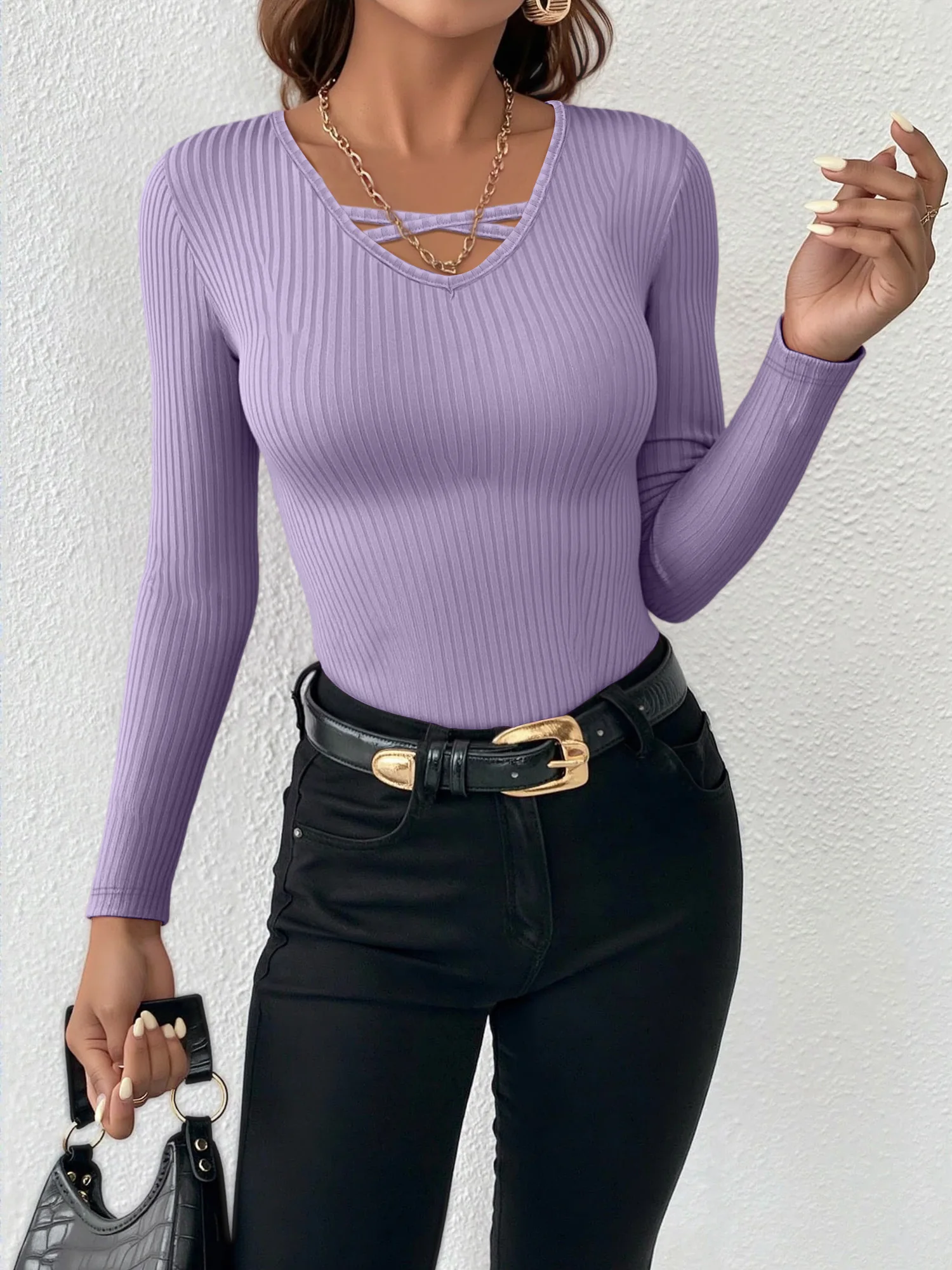 Trendy Crisscross V-Neck Long Sleeve Ribbed Top - Solid Color Slim Fit Blouse for Fashionable Street Style, Instagram, and OOTD $10.19