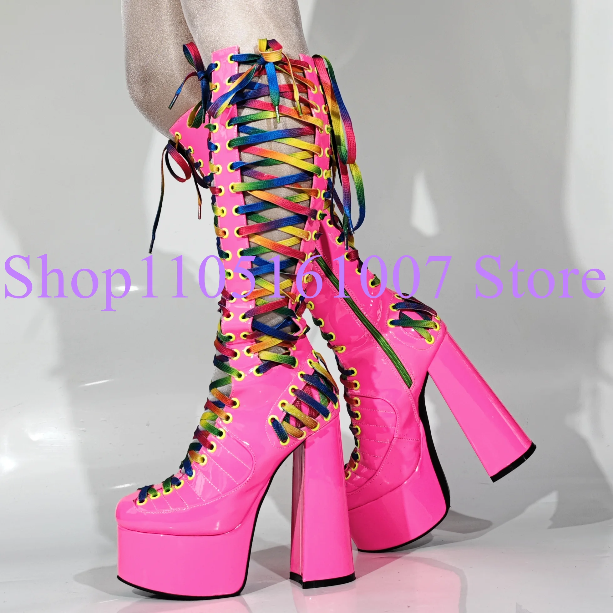 New Mixed Color Lace-up Woman Sandals Boots Fashion Design Chunky Heel Platform Knee High Boots Lady Banquet High Heels Shoes $86.03