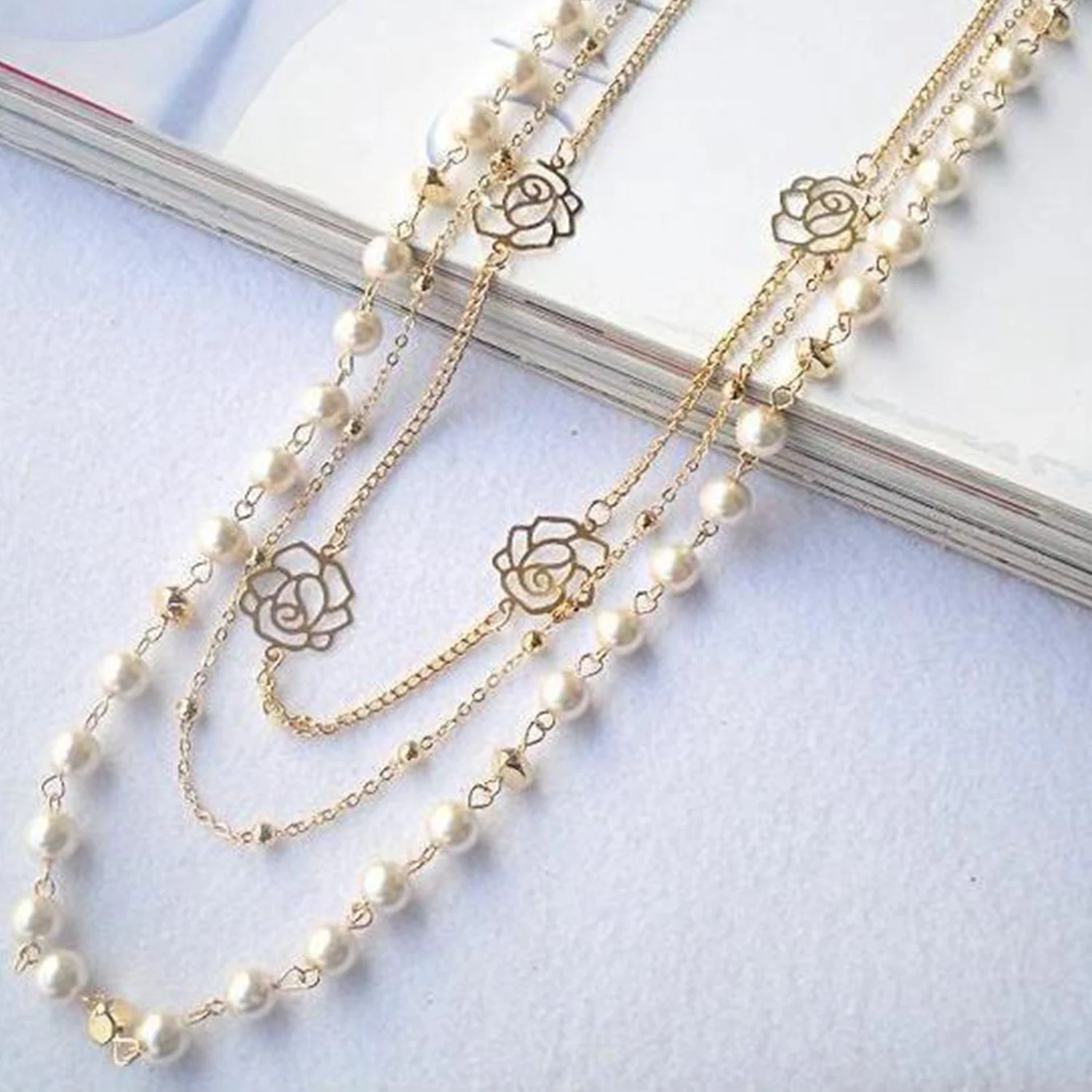 Luxury Camellia Multilayer Long Pearl Necklace Brand Design Rose Flower Sweater Chain Necklace For Woman $3.35