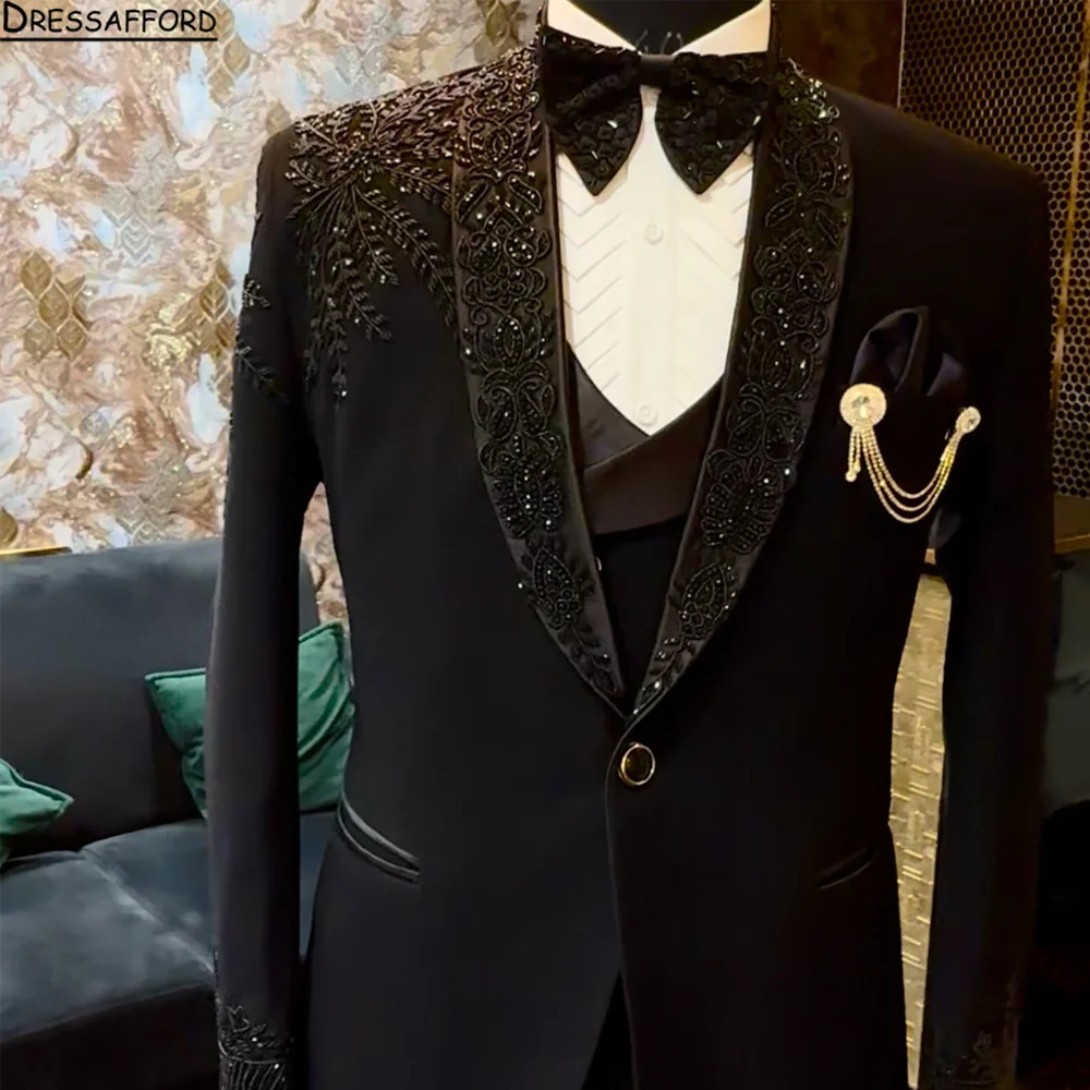 Luxury Black Crystals Men Suits High-qublity Jacquard Groom Wedding Tuxedos Slim Fit Fashion 3Pieces Sets Handsome Costume Homme $202.75
