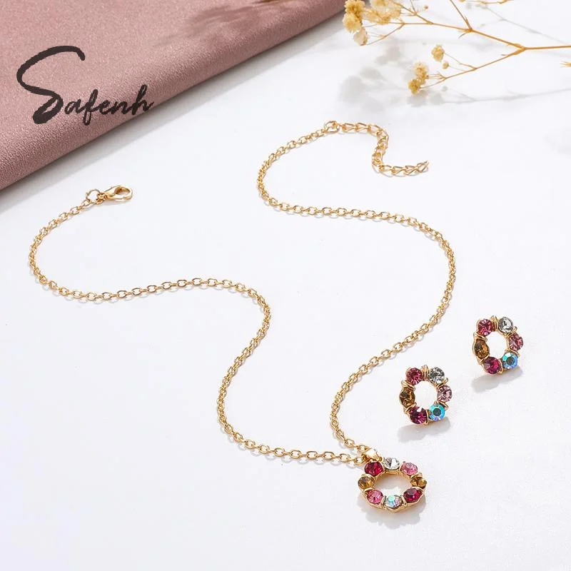 3Pcs Gold Necklace Earrings Set Ladies Celebrity Simple Fashion Style Exquisite Stained Glass Diamond Circle Shape Jewelry $0.72