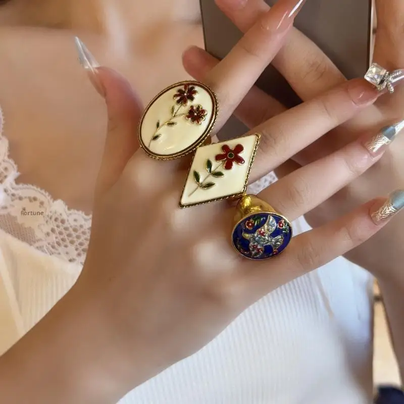 Elegant Vintage Geometric Drip Oil Flower Elliptical Opening Ring Fashionable Luxury Jewelry Personalized Gift for Women $2.48