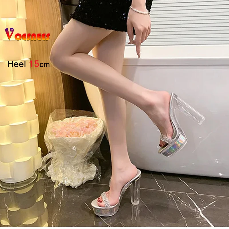 Sequin Decor High Heels Slippers Women 15CM Fashion Platform Crystal Sandals Transparent PVC Slide Summer Night Club Woman Shoes $20.80
