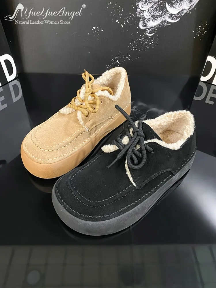 Versatile Women Winter Warm Fleece Lining Lace Up Round Toe Mid Heel Thick Platform Pumps Comfortable Cow Suede Leather Shoes $82.37