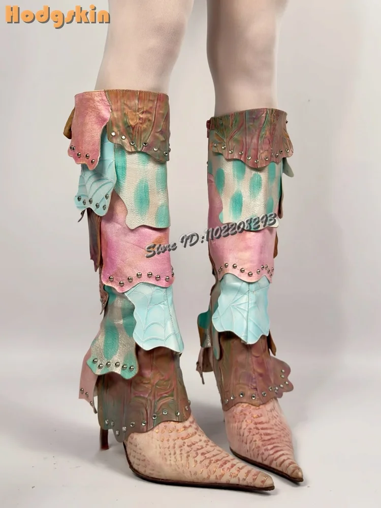 Retro Fish Scale Pattern Knee-high Boots Pointed Patchwork Rivet High Heel Knight Boots 2025 Autumn Fashion Women Stiletto Shoes $119.93