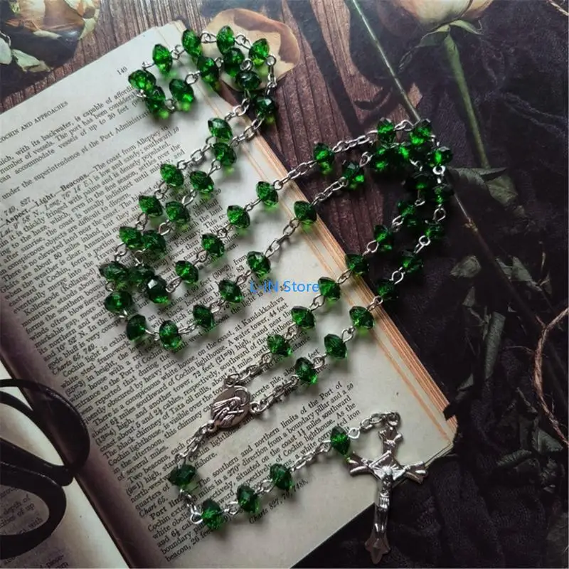 Fashion Green Stones Rosary Beads Necklace Christian Clavicle Chain Ladies Sweet Pendant Men and Women $0.89