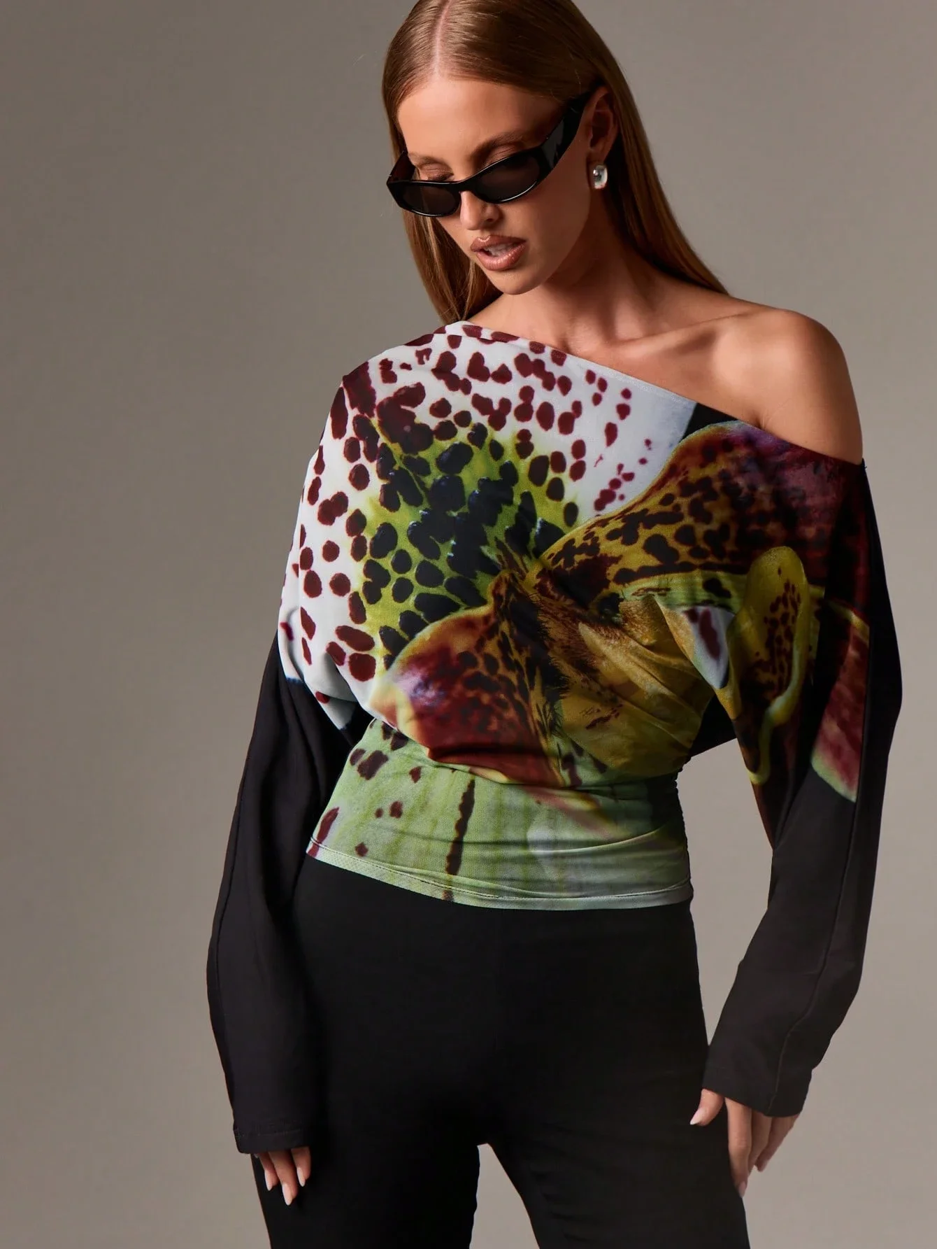 Asymmetrical Off Shoulder Long Sleeve Top With Floral Print Ruched Waist Statement Evening Party Fashion $52.03
