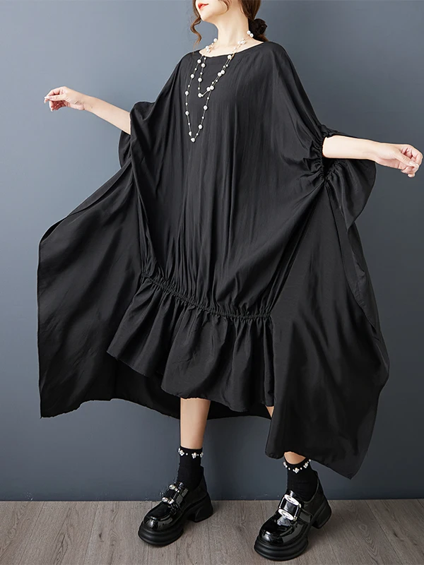 Loose Fashion Pure Color Pleated Asymmetrical Batwing Sleeve Dress Women's Meat Concealing Dress Dark Style Short Sleeve roun... $28.21