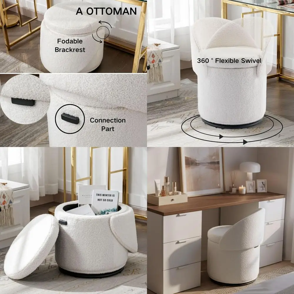 Swivel Upholstered Ottoman with Storage, White Round Stool for Vanity and Bedroom, Ideal for Small Spaces $253.32