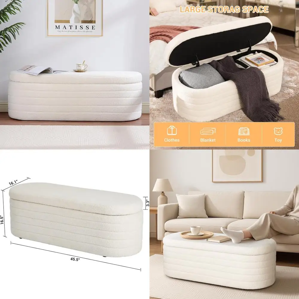 Modern Upholstered Storage Ottoman Bench, White Oval Window Seat with Safety Hinge Lid, Living Room Furniture $101.23