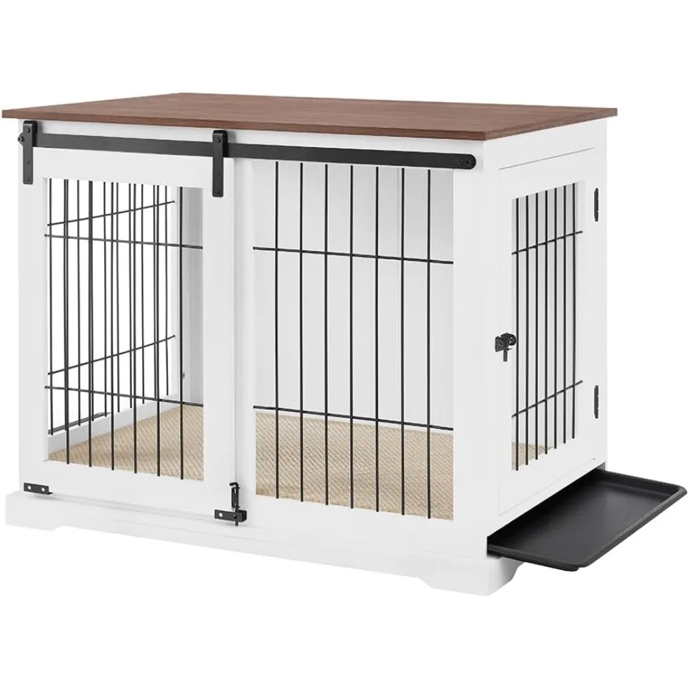 Dog Crate Furniture with Sliding Barn Door, Stylish Double Doors Wooden Kennel with Tray and Cushion, Decorative Indoor Pet Hou $318.97