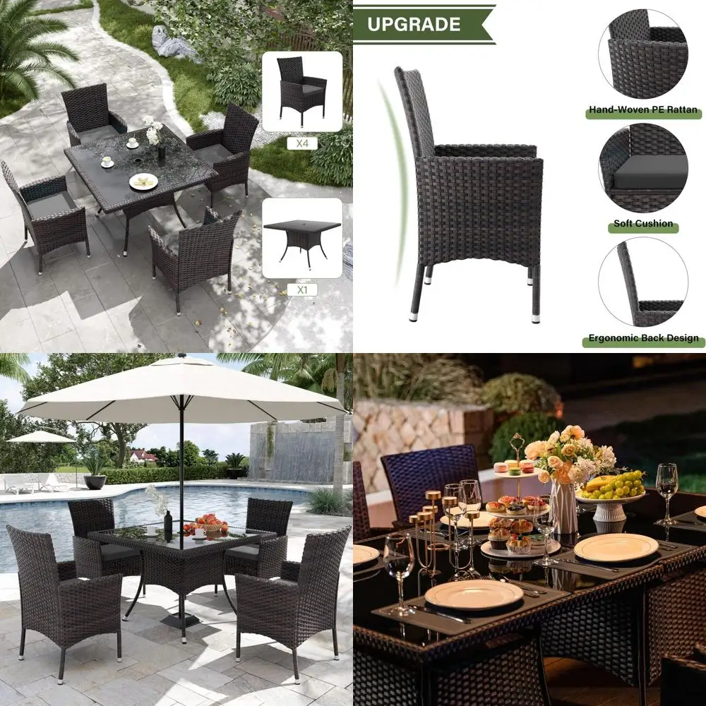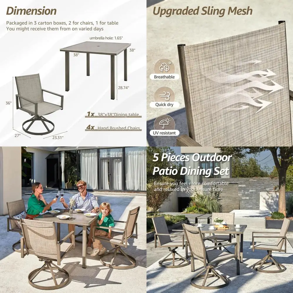 4-Piece High-Back Mesh Sling Swivel Dining Set with 38 Square Woodgrain Steel Table & Umbrella Hole $644.37