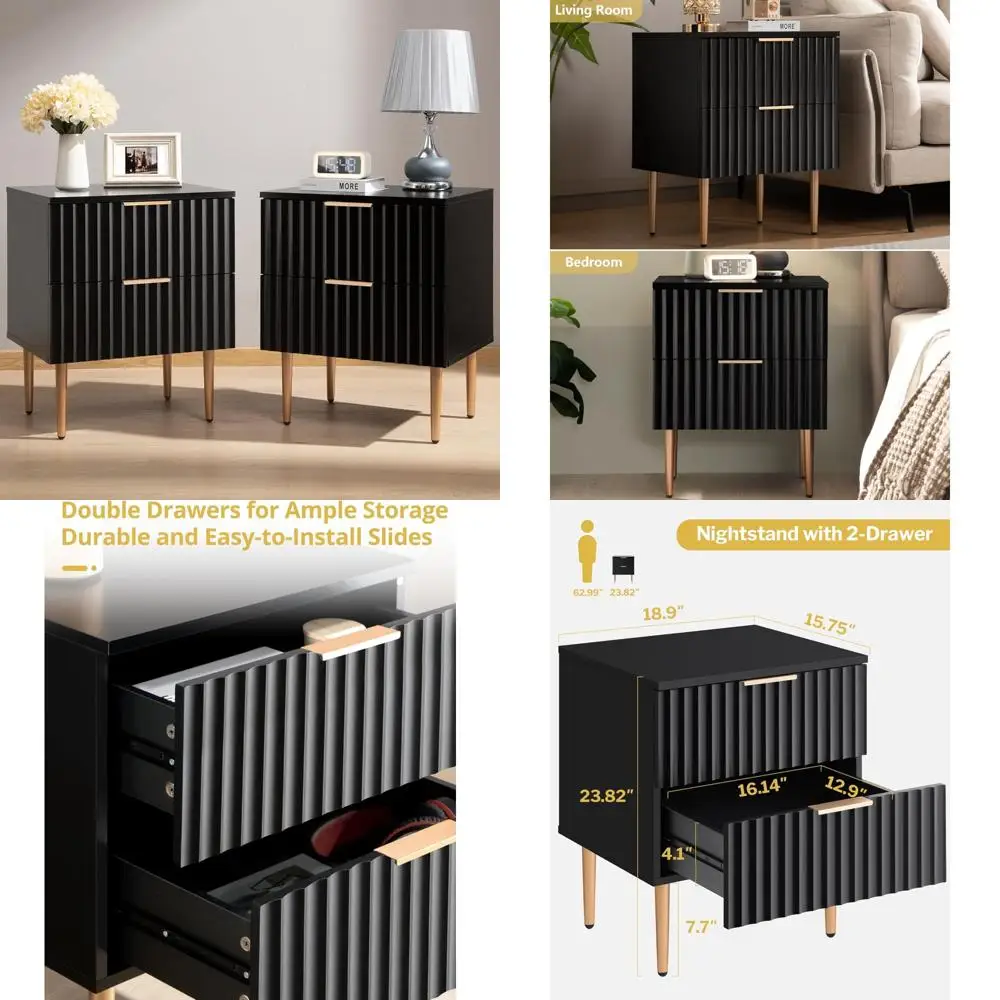 Modern Fluted Glossy 2-Drawer Nightstand Set, Wide Storage Bedside Table for Bedroom, End Side Furniture $202.16