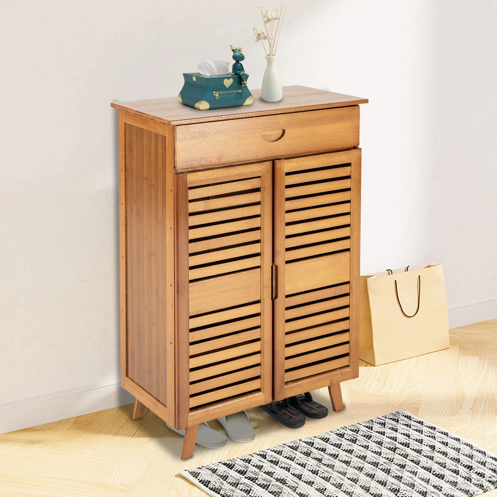 Bamboo Shoe Cabinet W/ Double Doors & Drawer, 4-Tier Large Capacity Shoe Storage, Retro Brown Organizer for Hallway & & Bedroom $80.22