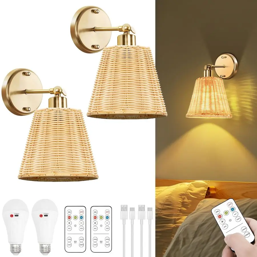 Rattan Rechargeable Battery Operated Wall Sconces Set of Two with Remote, 3 Colors Dimmable Wireless Wall Light, 5200mAh Indoor $76.96