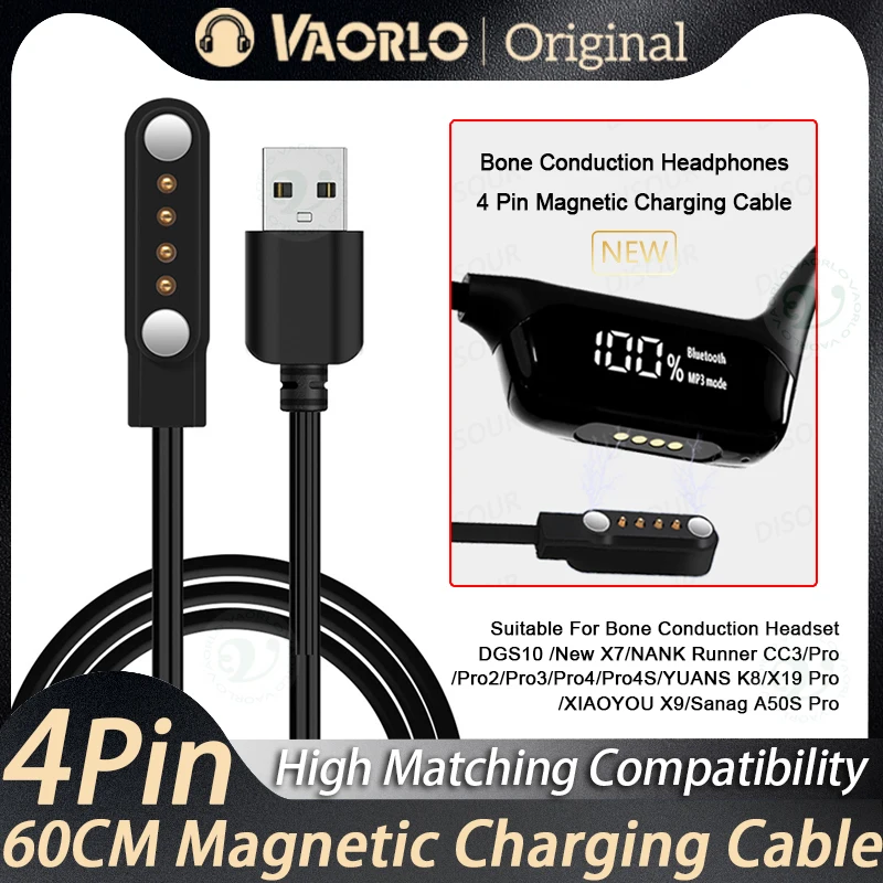 VAORLO 4 Pin 60CM Magnetic Charging Cable Suitable For New X7 Headset DGS10 Bone Conduction Bluetooth Sports Wwimming Headphones $5.35