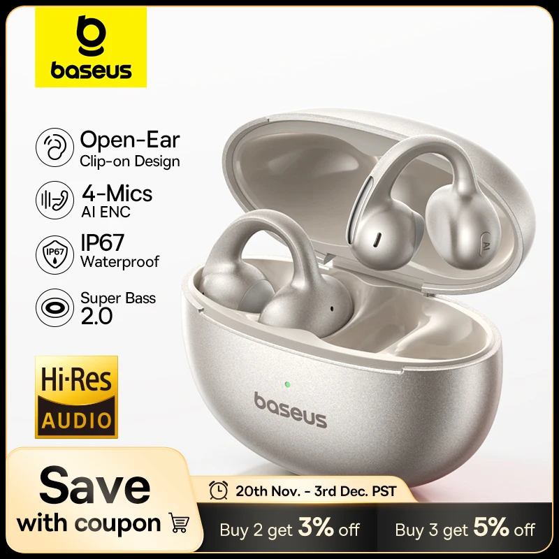 Baseus MC1 Pro Ear Clip Wireless Earphones Bluetooth 6.0 Hi-Res Ultra Open Earbuds earrings 4-Mic ENC Clip on ear buds Headphone $38.35