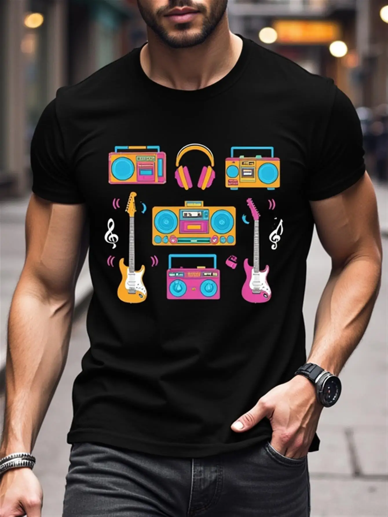 80S Music Festival T-Shirt Retro Mtv-Style Graphic T-Shirt with Headphones and Music Symbols Suitable for Concerts, Parties, Casual Wear Men's Nostalgic 80S Decade Clothing Gift $4.23
