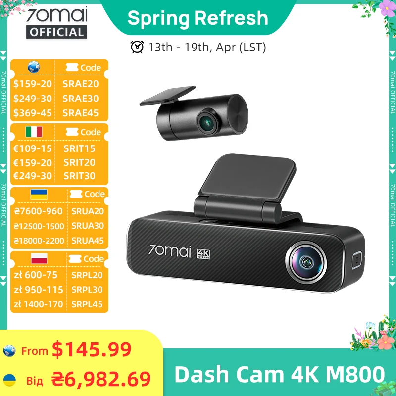 70mai Dash Cam 4K M800 2160P eMMC Built-in 128GB GPS ADAS Support 24H Parking Guard 4G Compatible Upgraded Ver. of 70mai M500 $158.23