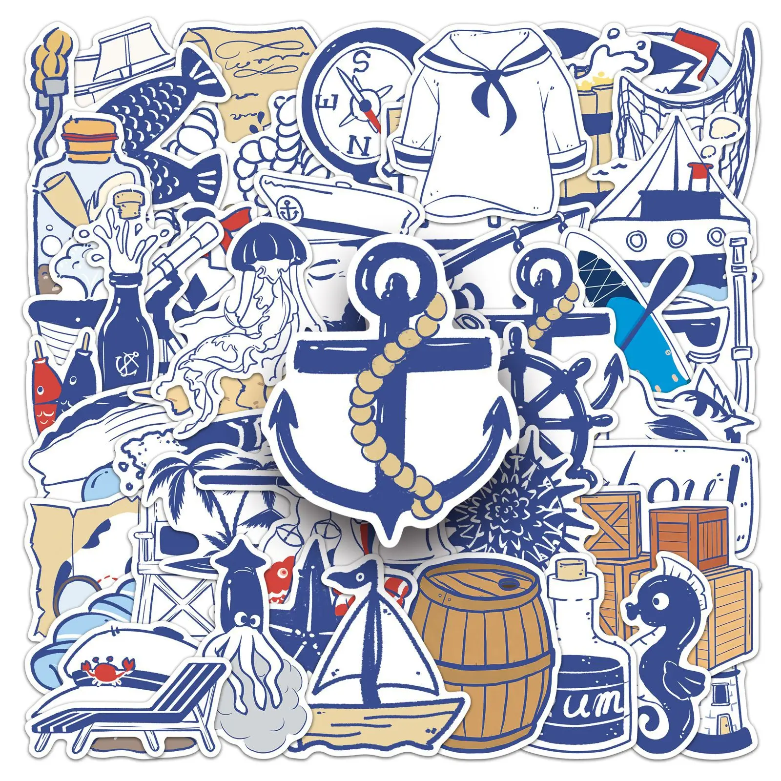 50-100PCS Navy Nautical Aesthetic Stickers-Hand-Drawn Sailing Adventure Blue Waterproof Vinyl Decals for Laptop Notebook $2.91