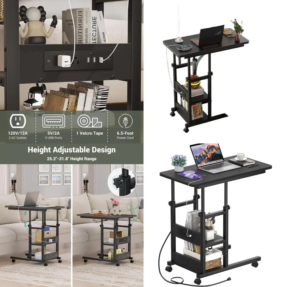 Adjustable Height Charging End Table, Mobile Laptop Side Table with Wheels, 3-Tier Storage Sofa Table for Living Room, Black $118.12