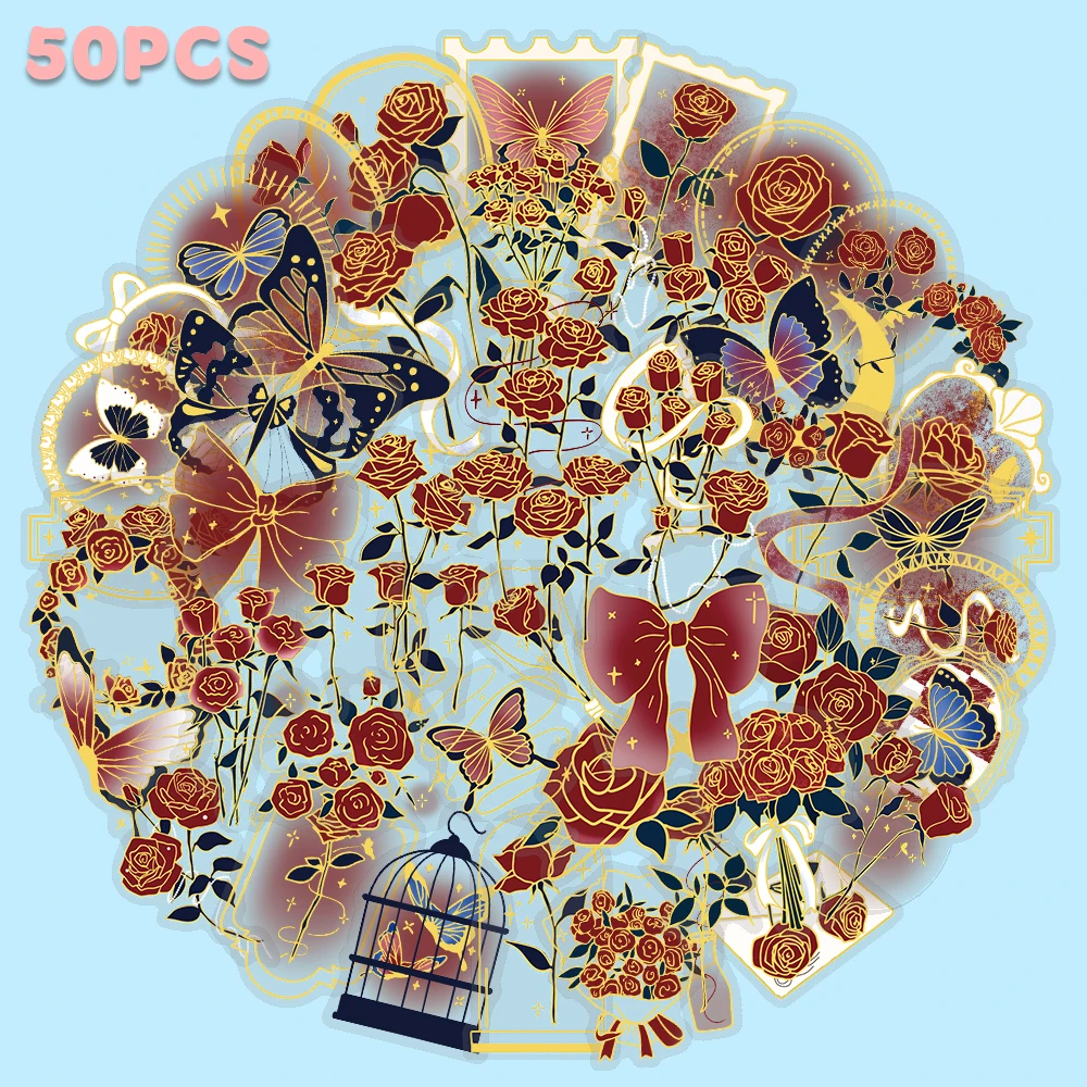 50pcs Butterfly&Rose Gold Stamping Sticker Shine Aesthetic Decal For Laptop Phone Luggage Scrapbook Decoration Sticker $3.60