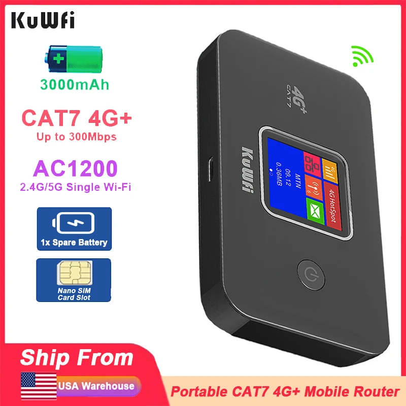 KuWFi CAT7 4G+ Modem 1200Mbps 2.4G/5G Single WiFi Portable 4G LTE Router 3000mAh Battery Plug and Play Nano USIM Slot 10 User $51.51