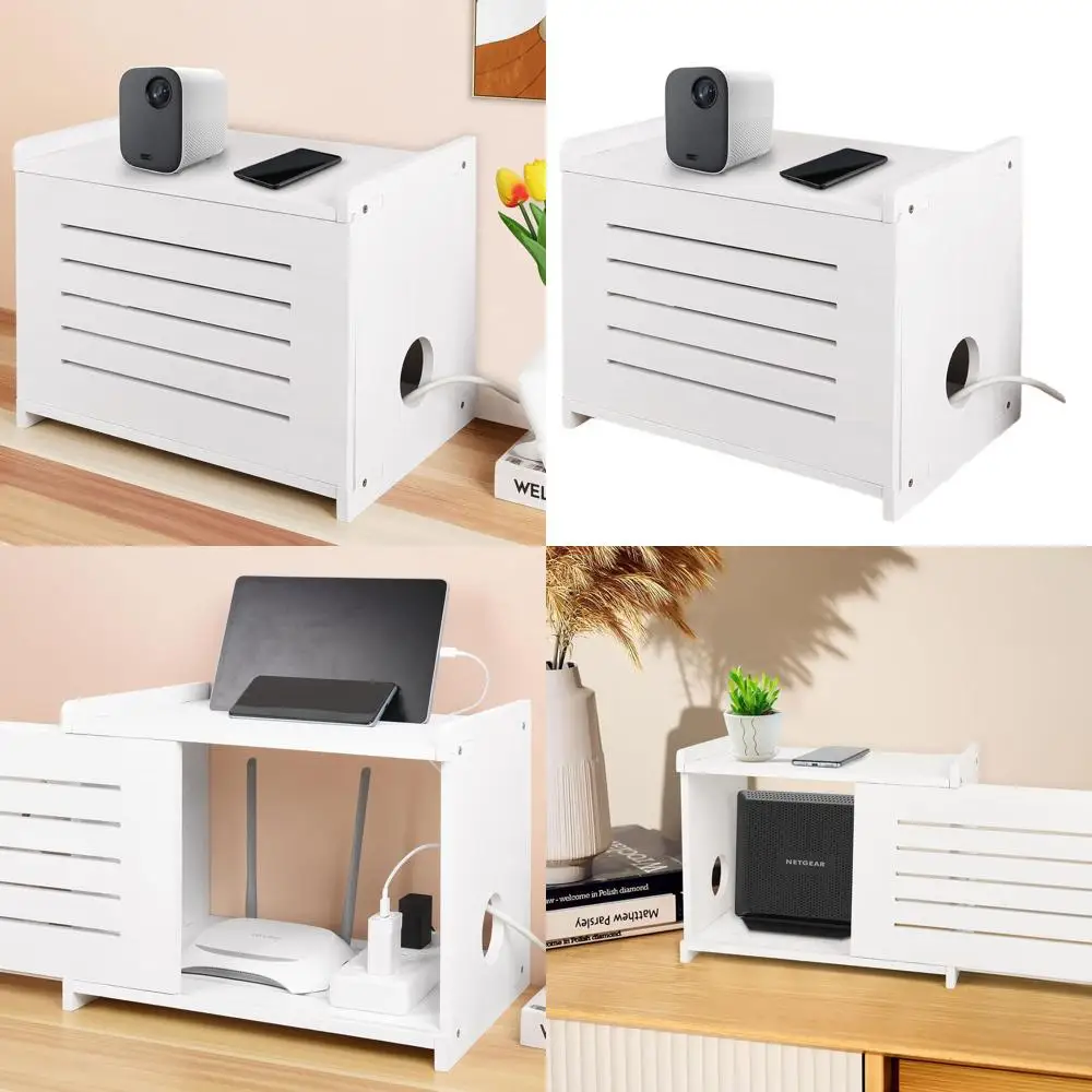 White Router Shelf with Projector Stand, Storage Box, and Cable Management for Organized Power Strip $62.84