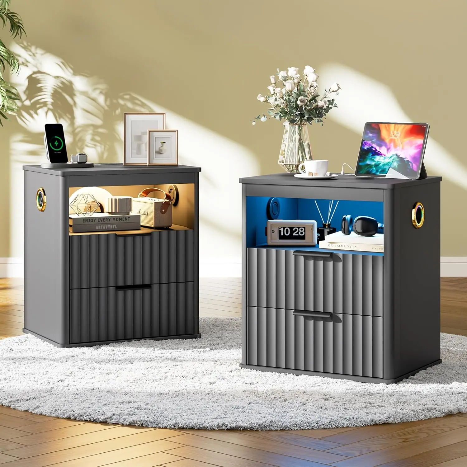 Fluted Night Stand Set of 2 - with Bluetooth Speaker,Smart Bedside Table with Charging Station,LED End Tabe with Human Sensor Li $129.81