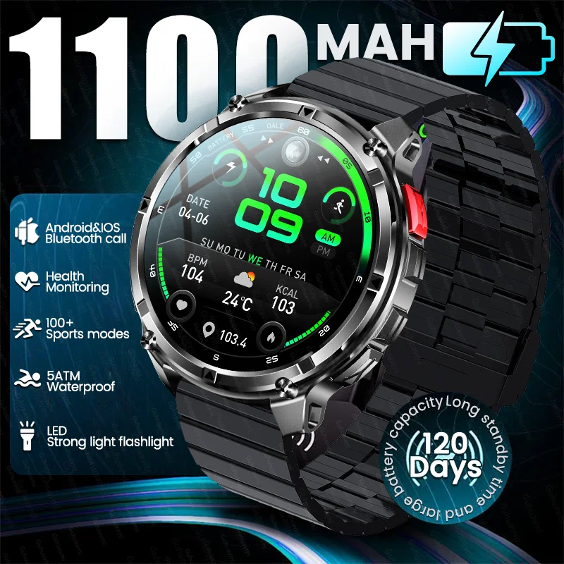 New 1100mAh Battery Outdoor Ultra Durable Men Smartwatch Flashlight Heart Rate Bluetooth Call 5ATM Waterproof Sports Smart Watch $65.56