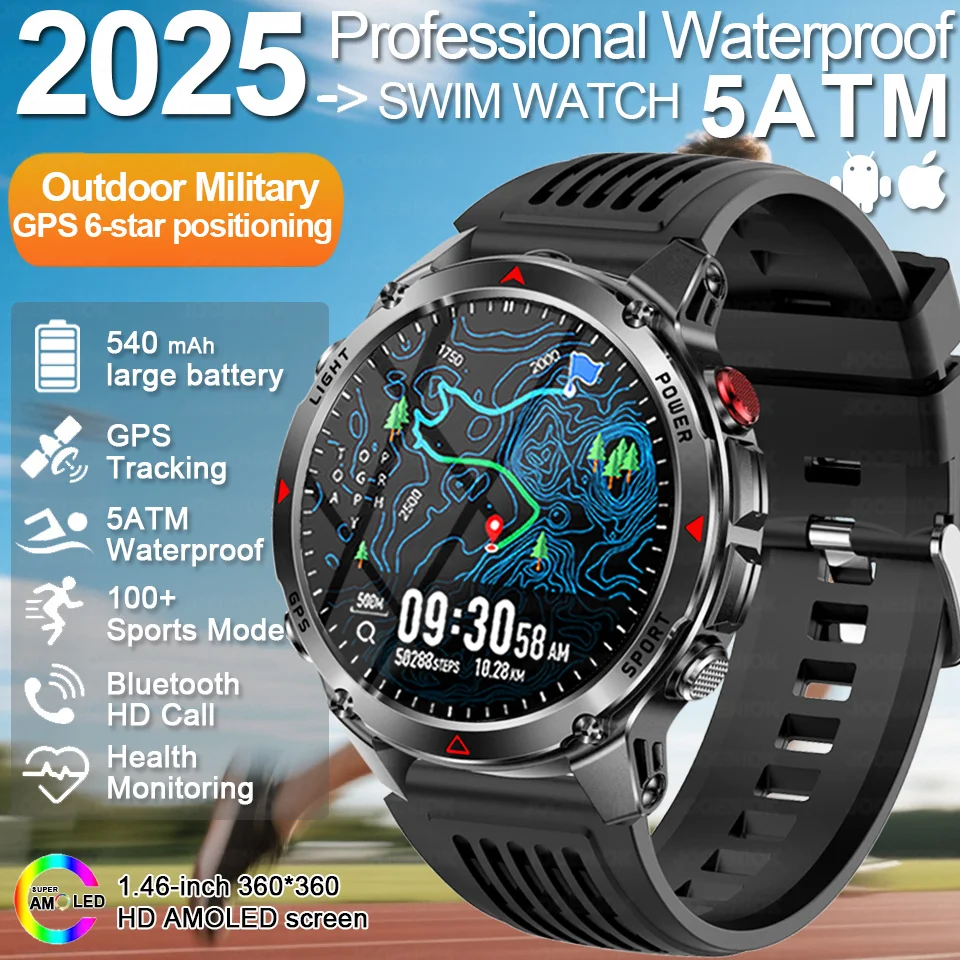 Outdoor Sports Smart Watch Men Built-in GPS LED Flashlight 540mAh Compass Bluetooth Call 5ATM Waterproof Smartwatch Gift 2025New $182.15