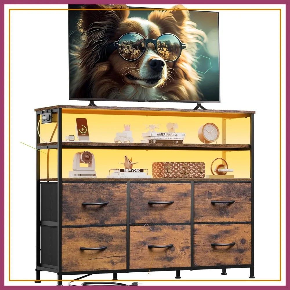 40-45 Inch TV Stand with LED Lights & Charging Station, Entertainment Center with 6 Fabric Drawers for Living Room, Rustic Brown $73.03