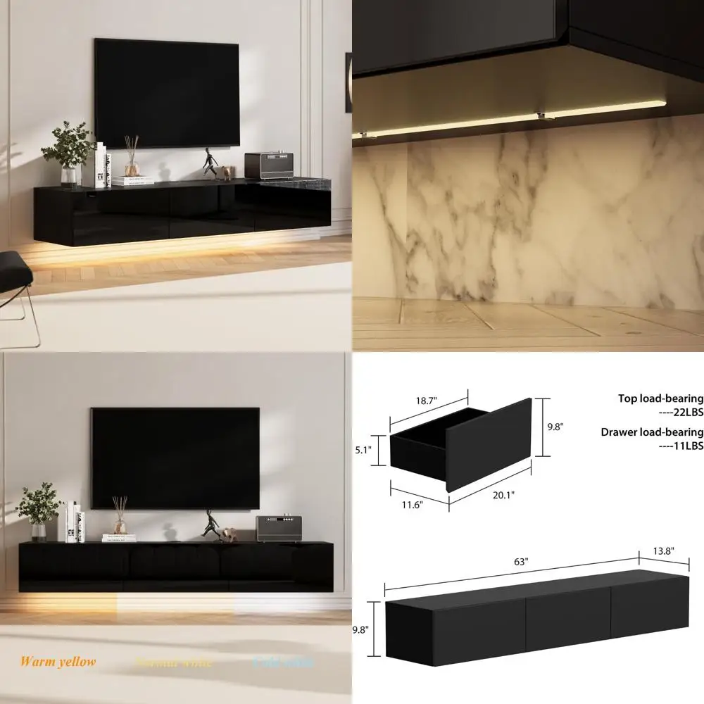 "63-inch wide led lighted floating tv stand with 3 large drawers, suitable for tvs up to 65-inch, modern extendable entertainmen $159.80