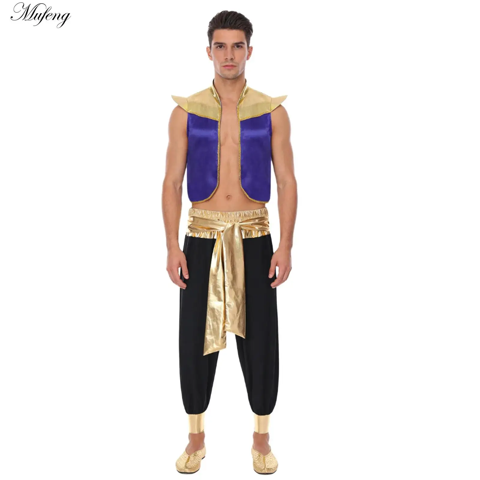 Mens Halloween Arabian Prince Costume Mythical Aladi Party Cosplay Fancy Dress Outfit Metallic Waistcoat with Belted Pants Sets $8.99