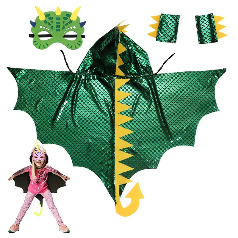 Child Green Dinosaur Cloak with Mask Tail Wristbands Cosplay Costume Halloween Stage Performance Outfit Boys and Girls Gifts $8.78