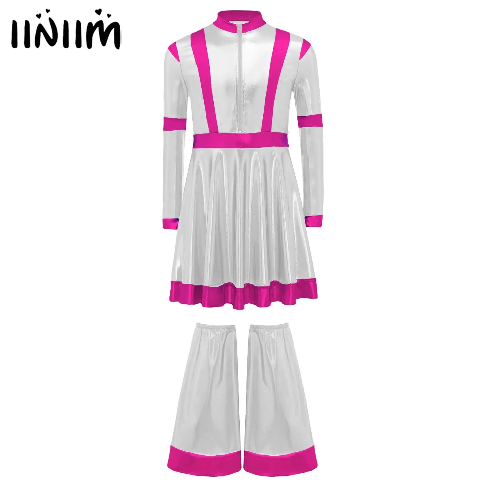 Kids Girls Shiny Metallic Alien Outer Space Cadet Astronaut Cosplay Costume High Waist Robot Halloween Dress with Leg Covers $8.09