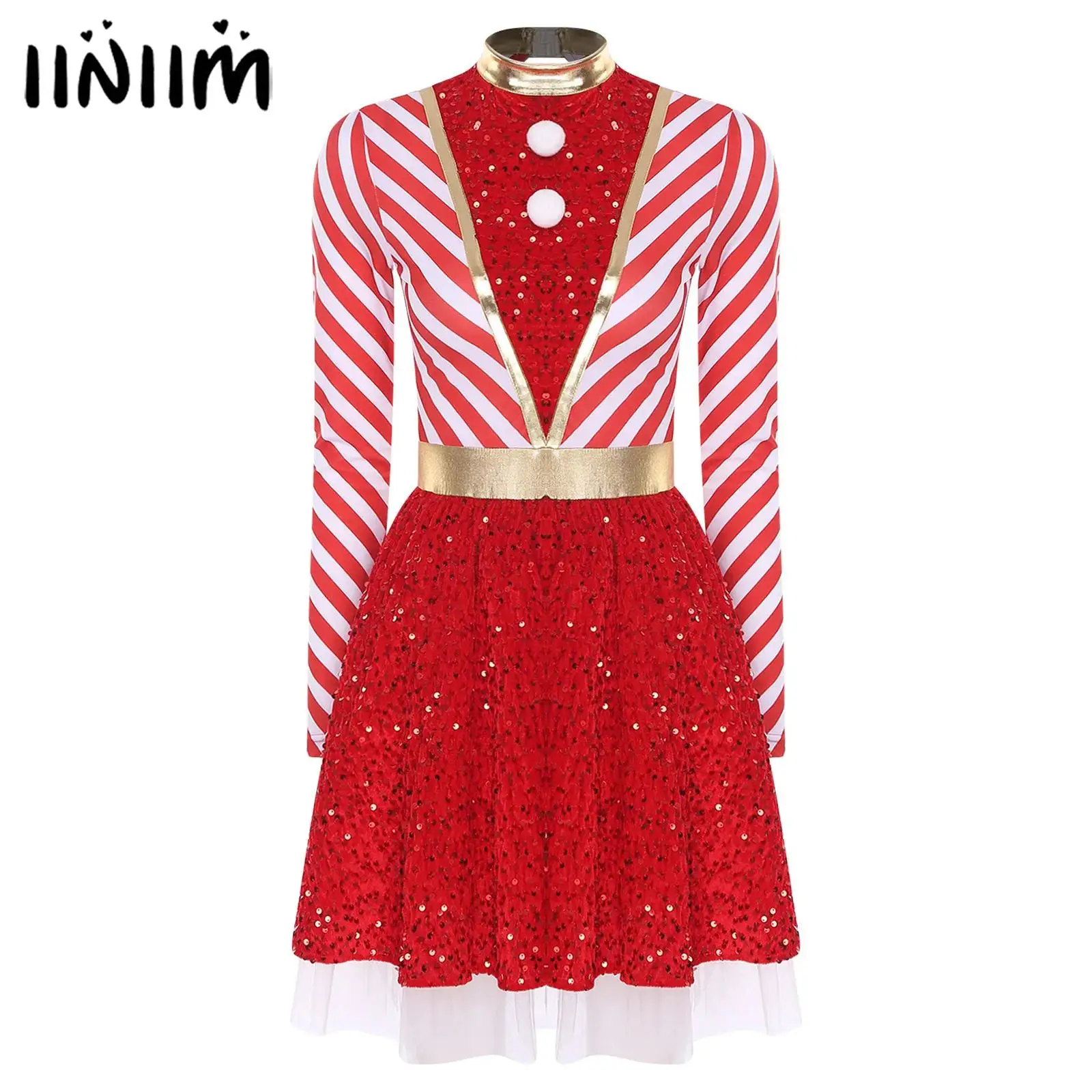 Girls Elf Christmas Xmas Santa Elf Cosplay Costume Plush Sequins Flared Dance Unitards Candy Cane Jumpsuit with Arm Sleeve Set $8.32