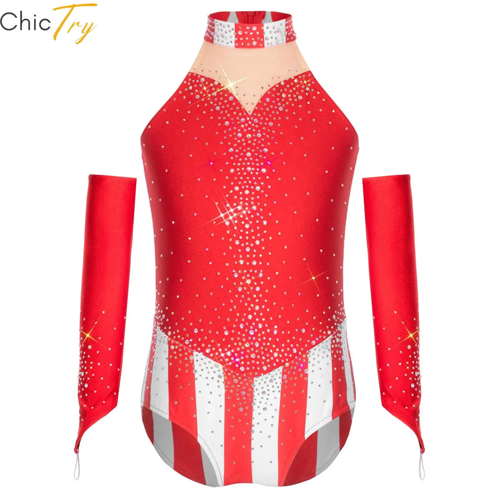 Kids Girls Circus Costume Cosplay Party Leotard Sleeveless Rhinestones Bodysuit with Oversleeves Glittery Dance Performance Wear $8.05