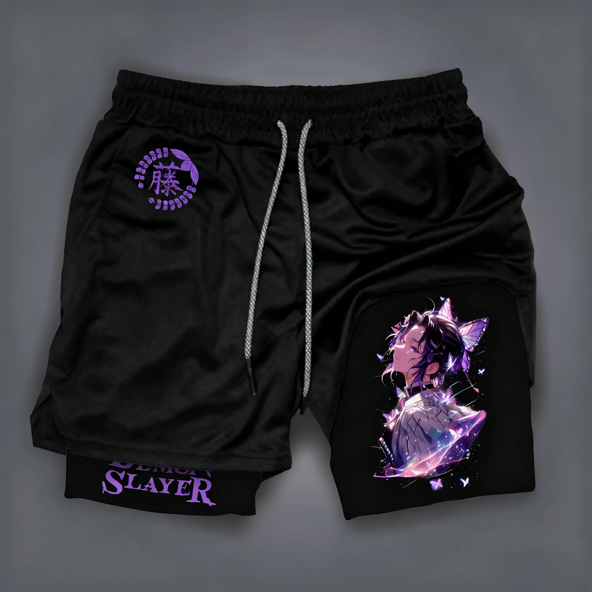 2025 Demon Slayer Anime Print Double-layered Shorts, American Summer Fitness Men's and Women's Loose and Fashionable Shorts $9.05