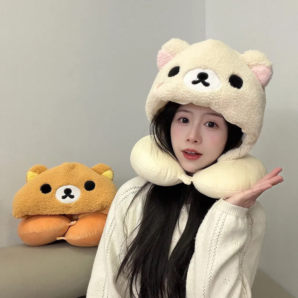 Adorable Rilakkuma Hooded Neck Pillow Soft Plush Bear U-Shaped Travel Pillow White Brown for Travel Office Warm Napping Girl $21.32