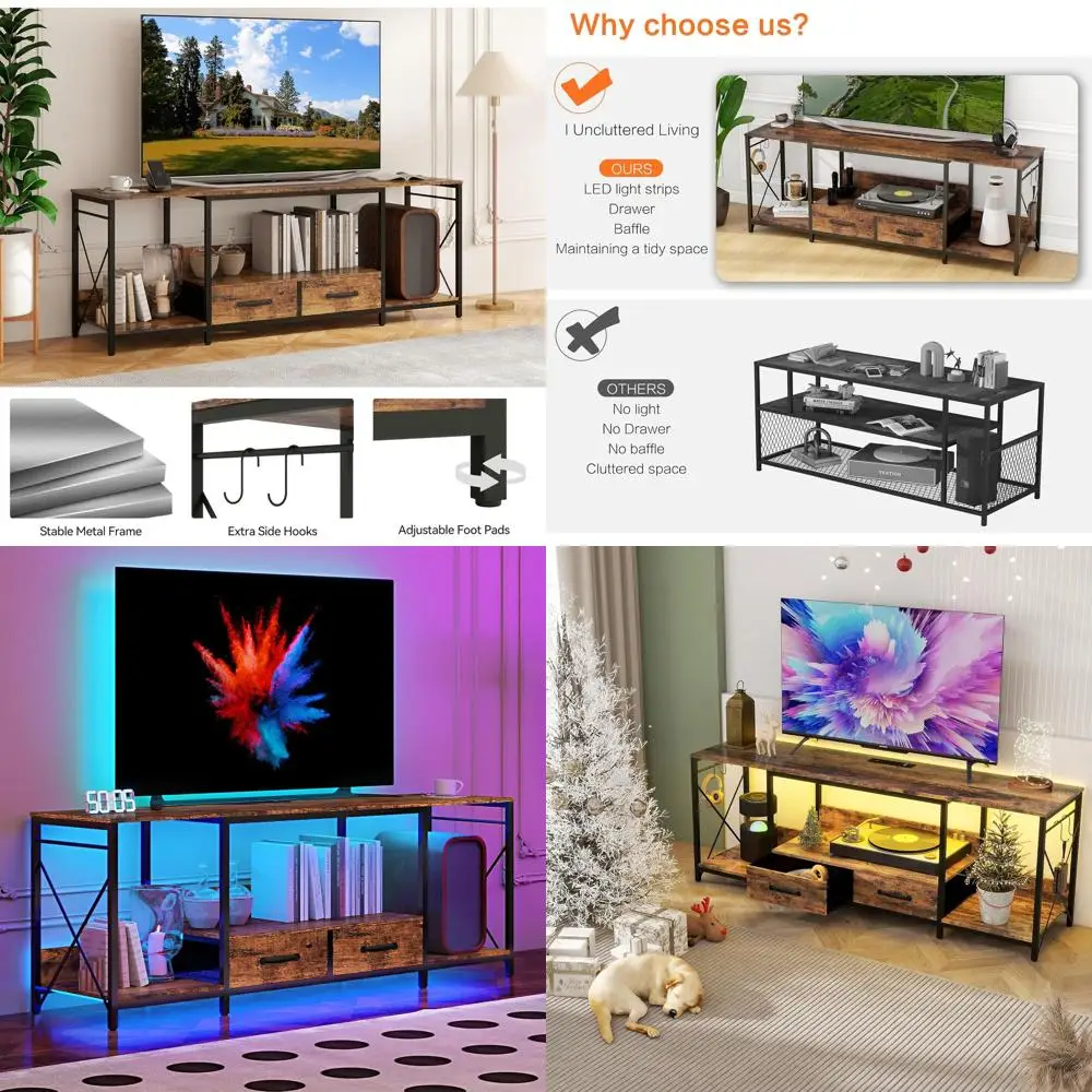 75 Inch TV Stand with Power Outlets, Fabric Drawers, and Open Shelves - Industrial Style Media Console for Living Spaces $159.88