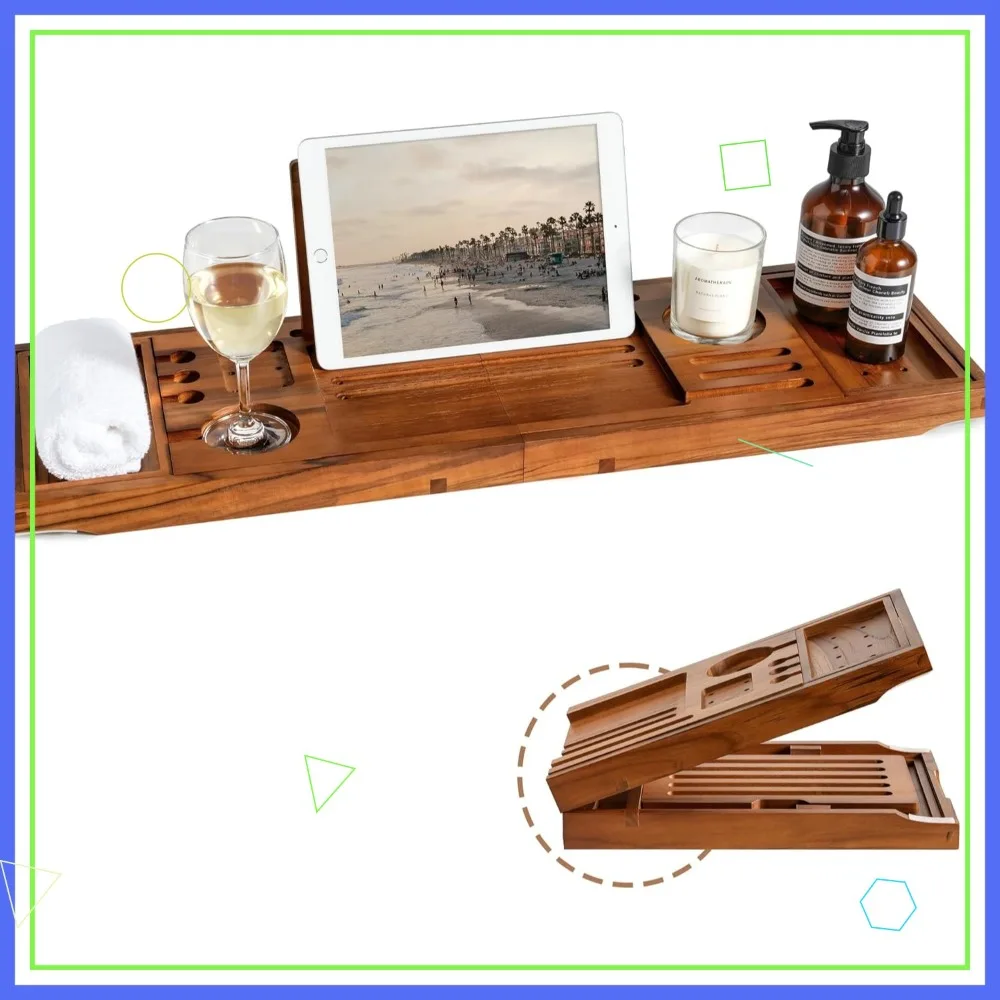 Adjustable Teak Bathtub Tray with Wine Holder, Tablet Stand & Splash-Proof Design for Relaxing Bath Time $75.16