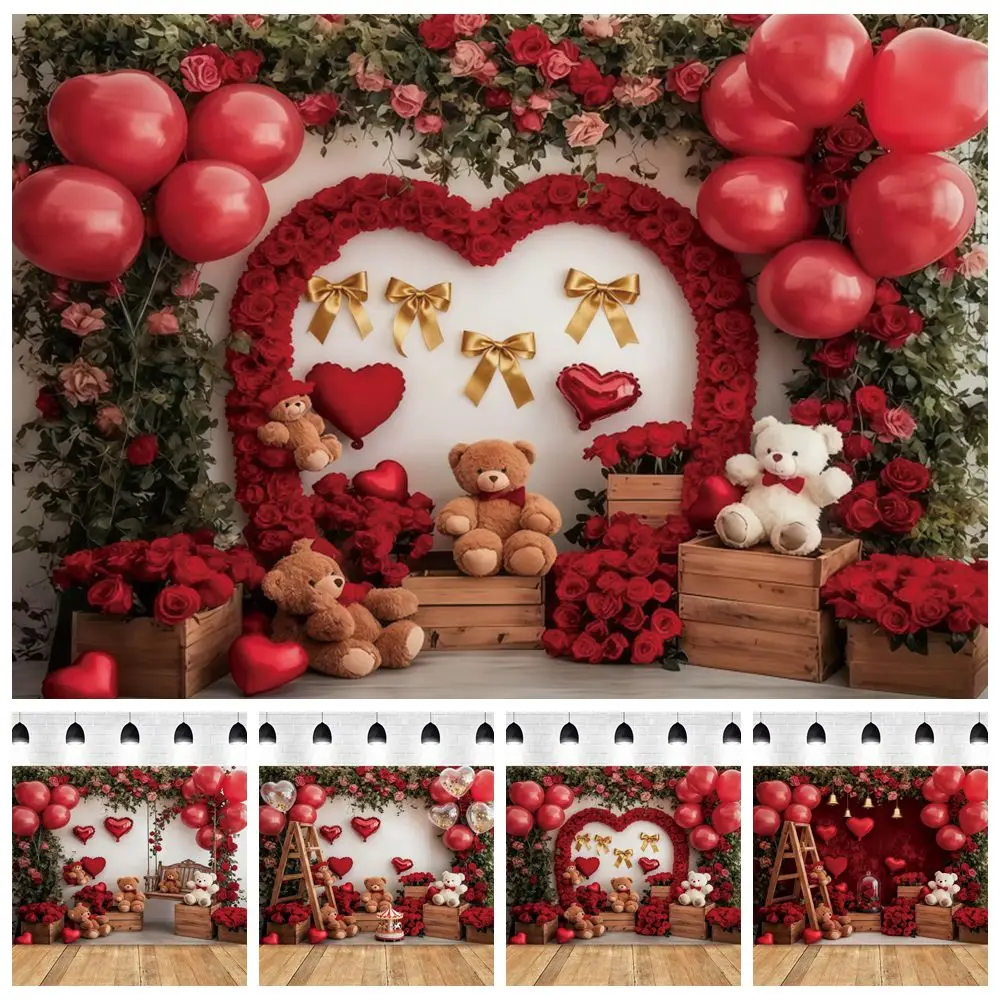 Valentine's Day Photography Backdrop Love Heart Balloons Flowers Toy Bear February 14th Party Decor Photo Background Photostudio $3.95