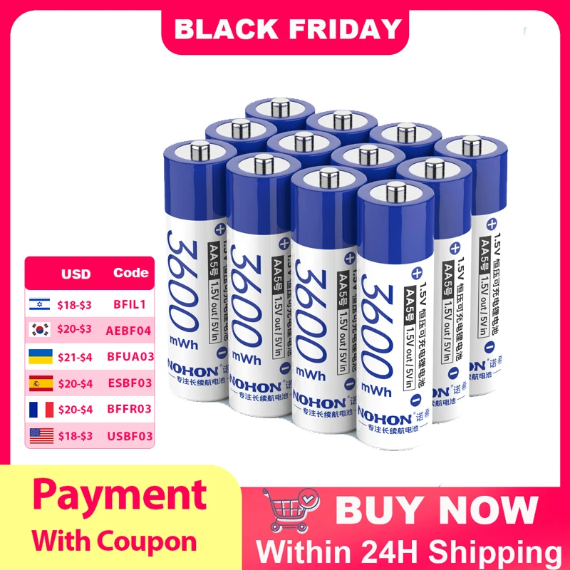 NOHON 1.5V AA Rechargeable Battery 3600 mWh Li-ion Battery For Remote Control Mouse Electric Toy Battery AAA 1300mWh Battery $14.27